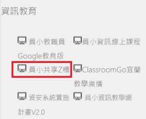 《方法一》進入員山國民小學網站>點選左邊選單【資訊教育】內【員小共享Z槽】